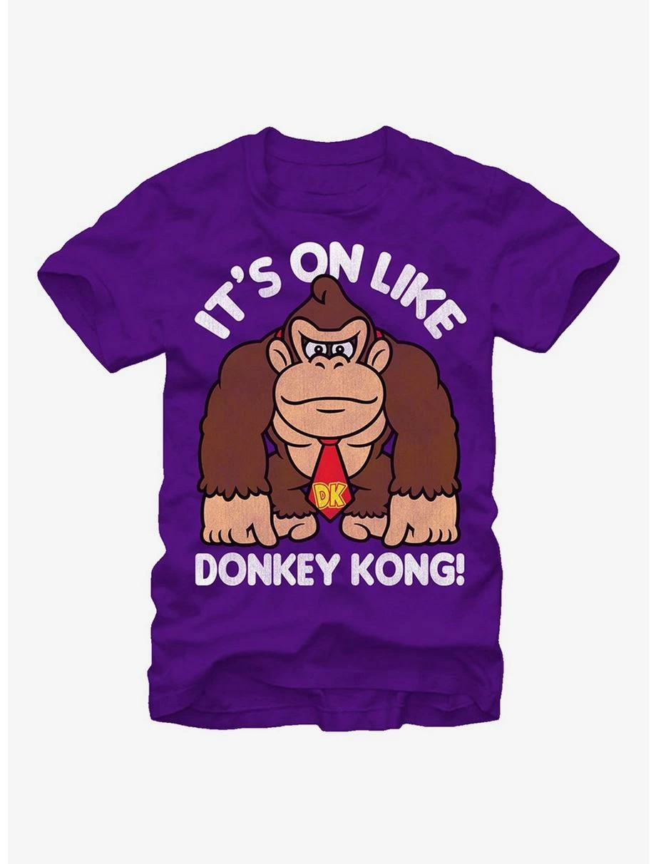 Get your game on with the Nintendo Donkey Kong Fist Pump Purple T-Shirt! Donkey Kong, everyone’s favorite gorilla, is printed on the front of this cool t-shirt, with the phrase “It’s on like Donkey Kong!” printed around him. 100% Cotton.