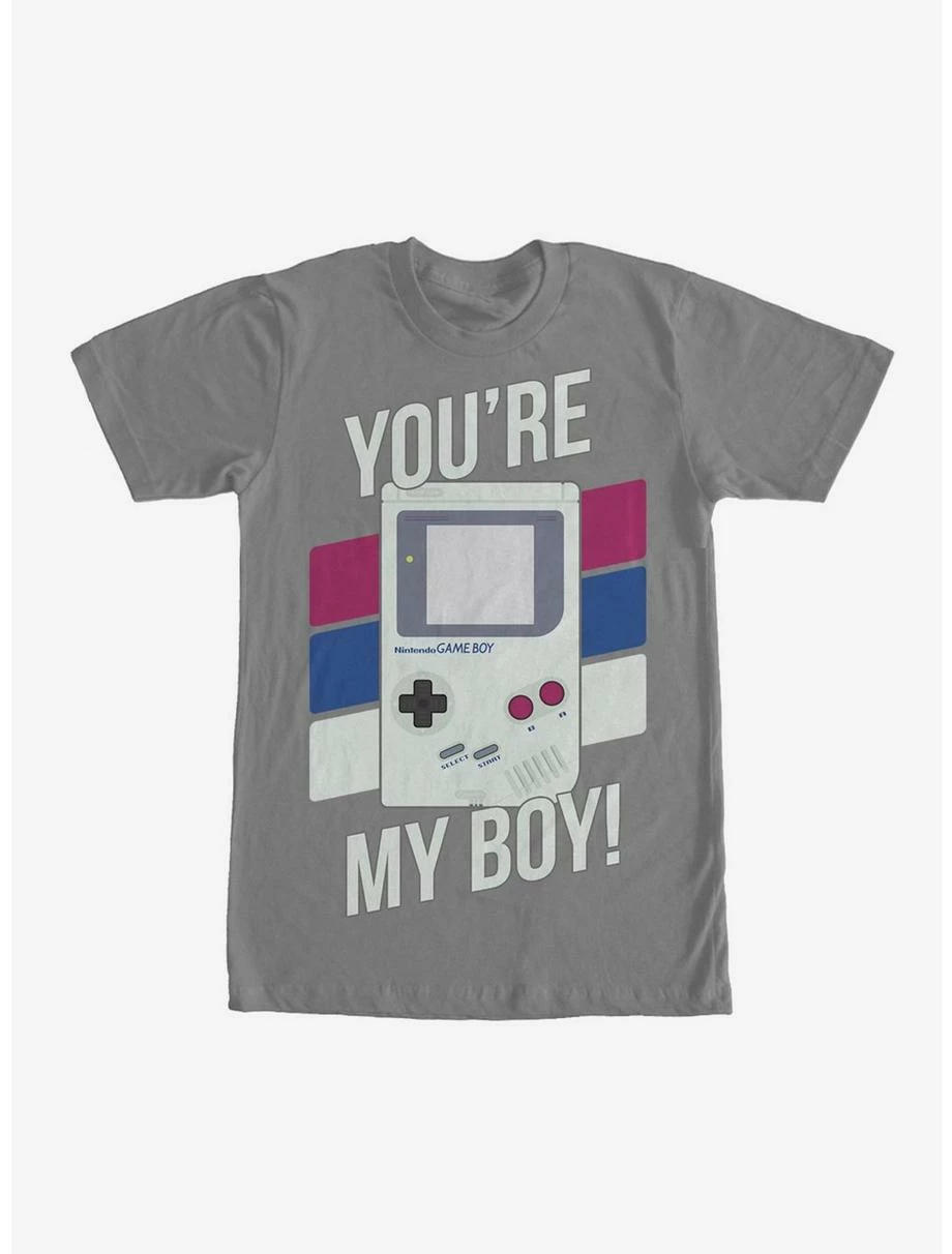 Boy, oh boy, this must be your lucky day because you just found the Nintendo Striped Game Boy You’re My Boy Charcoal Gray T-Shirt! A classic Nintendo Game Boy is printed on this durable gray shirt with “You’re My Boy” and three bold stripes around it. 100% Cotton.